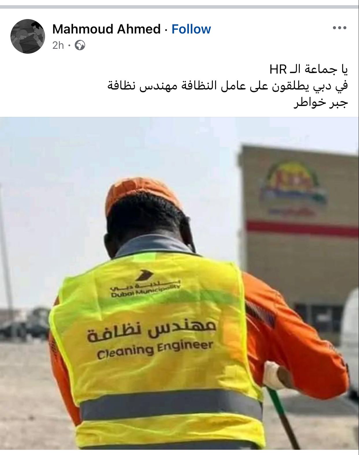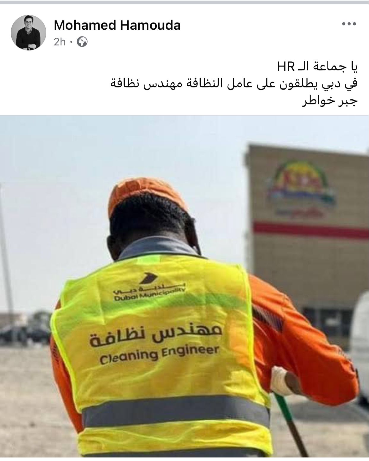 تداول منشور عبر منصة فيسبوك للتواصل الاجتماعي، يتضمن صورة لـ عامل نظافة في دبي بدولة الإمارات العربية المتحدة، يحمل لقب مهندس نظافة، مما أثار حالة من تعجب مستخدمي منصات التواصل الاجتماعي.