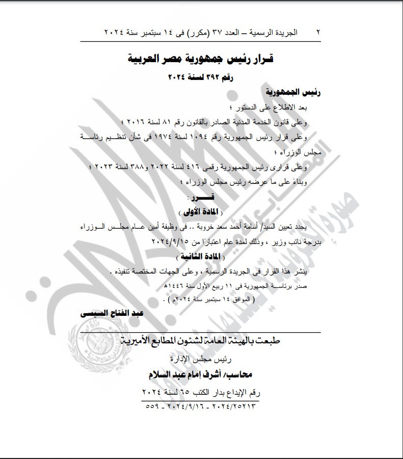 ونص القرار الصادر على تجديد تعين أسامة أحمد سعد خروبة في وظيفة أمين عام مجلس الوزراء بدرجة نائب وزير، وذلك لمدة عام اعتبارا من 19/ 9/ 2024.