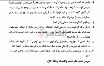 وكلفت الوزارة المدير المسؤول بحسب الأحوال برفع تقرير نصف سنوي للرئيس الأعلى لتقييم أداء من تم مد خدمته ويتم تقييم مدى الاحتياج لتجديد مدة خدمته لسنة أخرى في ضوء التقرير المشار اليه، ويراعى أن يرفع طلب مد الخدمة قبل بلوغ عضو المهنة الطبية سن التقاعد بمده لا تقل عن ستة أشهر.