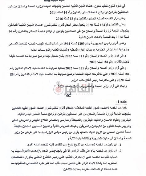وأكدت وزارة الصحة على عدم جواز إسناد أي أعمال إدارية خلال مباشرته لعمله بعد مد الخدمة، ويكون المطلوب مد خدمته على رأس العمل، وتعرض حالة المطلوب مد خدمته على اللجنة المشكلة لهذا الغرض بالوزارة لإبداء رأيها.