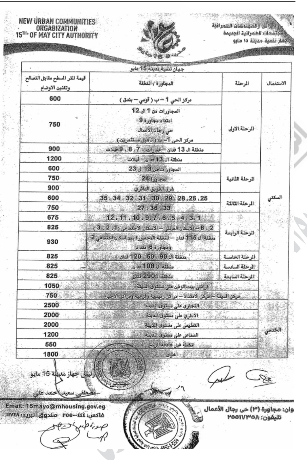 وفي وقت سابق، أعلن المهندس علي سعد رئيس جهاز مدينة 15 مايو، أن جهاز المدينة طرح عدد 7 قطع أراضي استثمارية يمكن التقديم عليها خلال الفترة من 1-9-2024 حتى 15-9-2024.