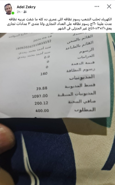 ونشر عادل عبر صفحتة قائلا: رسوم النظافه على فواتير الكهرباء اللى عمري ده كله ما شفت عربيه نظافه عدت علينا 160 جنيها رسوم نظافه على العداد التجارى الواحد، وأنا عندي 3 عدادات تجاري يعادل 160في3=480 جنيها، ده غير المنزلي فى الشهر.