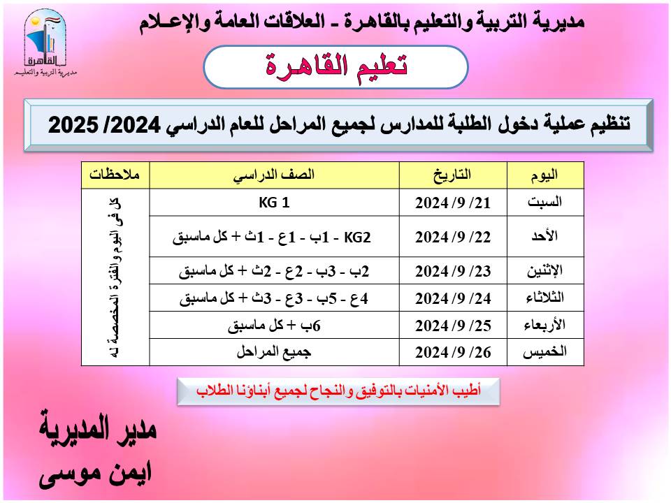 أعلنت مديرية التربية والتعليم بالقاهرة، عن تنظيم عملية دخول الطلبة للمدارس لجميع المراحل التعليمية للعام الدراسي 2024-25.