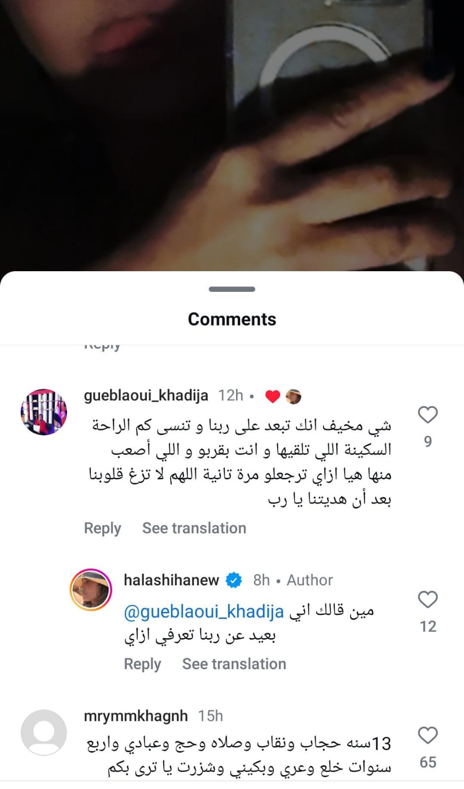 كما جاء تعليق آخر: 13 سنة حجاب ونقاب وصلاة وحج وعبادة، و4 سنوات خلع وعُري وبكيني، يا ترى بكم سنة هتمحي الحسنات بتبديل السيئات؟، الحجاب فرض من الله وليس من العبد والستر في الأرض ويوم العرض من الله مش من الناس، ربنا يهدي الجميع.
