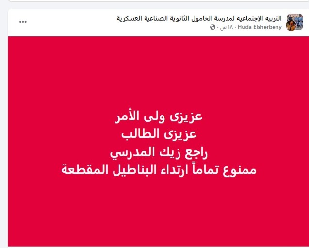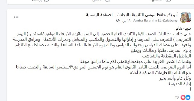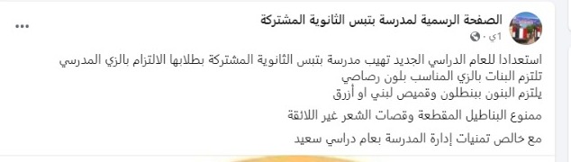 وكتبت المدارس عبر صفحاتها الرسمية على مواقع التواصل الاجتماعي فيس بوك: السادة الأفاضل أولياء الأمور كما تعودنا منكم على تعاونكم معنا يرجى الالتزام بالآتي: الزي المدرسي الموحد، الالتزام بمواعيد الحضور، تهذيب الشعر، الموبايلات ممنوعة، الأساور والخواتم والسلاسل ممنوعة، وإحضار الأدوات المدرسية الخاصة بكل مادة، عدم ارتداء البناطيل المقطعة.