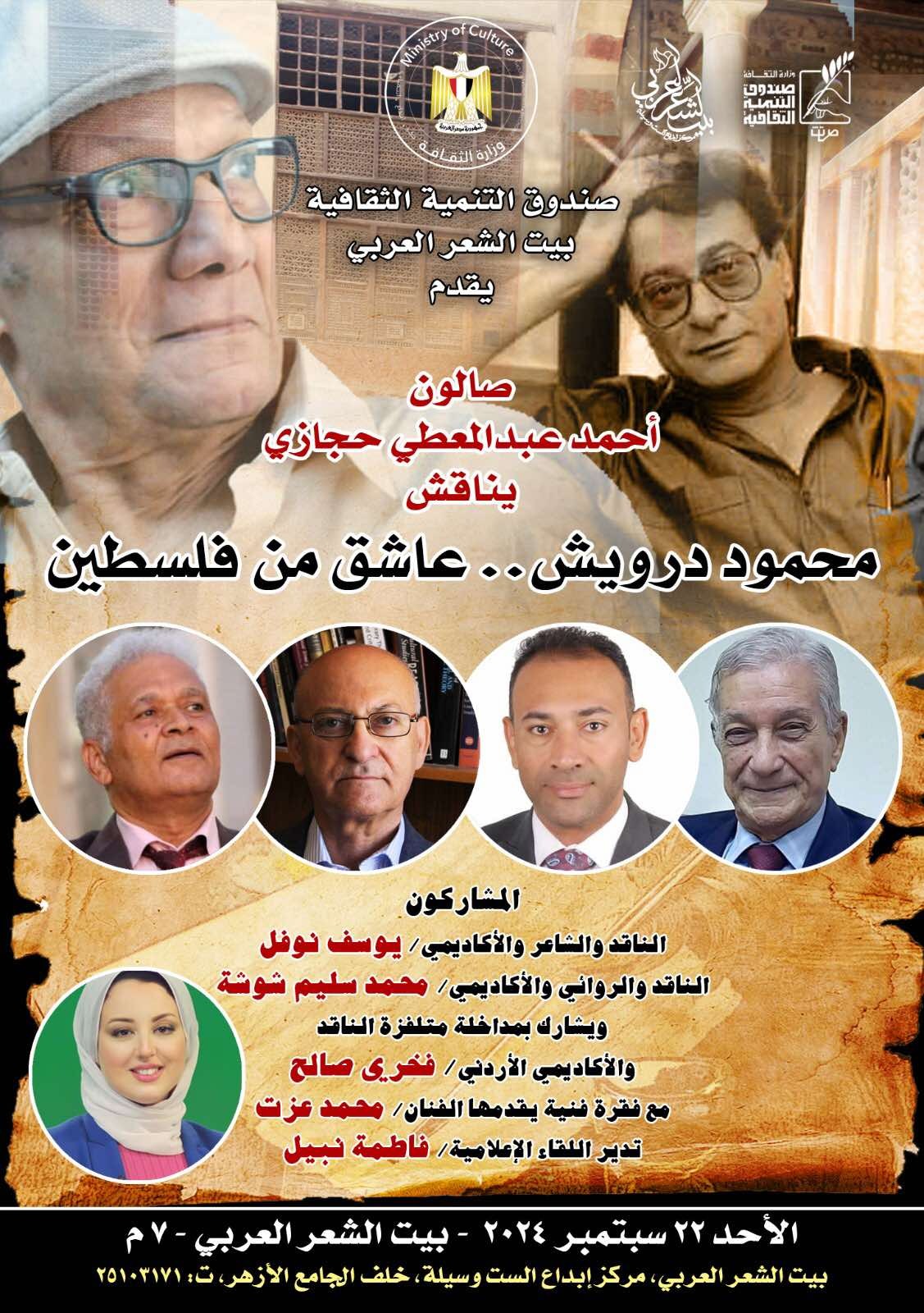 يعقد صالون الشاعر الرائد أحمد عبدالمعطي حجازي أمسية ثقافية احتفاء بالشاعر الفلسطيني الراحل محمود درويش، بعنوان «محمود درويش.. عاشق من فلسطين» وذلك في تمام الساعة 7 من مساء يوم الأحد المقبل الموافق 22 سبتمبر الجاري، بـ بيت الشعر العربي -مركز إبداع الست وسيلة- التابع لقطاع صندوق التنمية الثقافية.