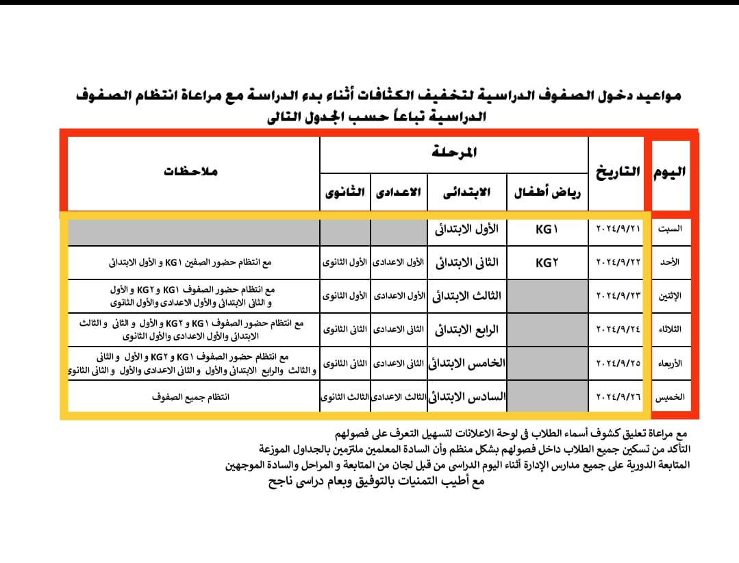 أعلن أشرف سلومة وكيل وزارة التربية والتعليم بمحافظة الجيزة، مواعيد دخول الصفوف الدراسية لتخفيف الكثافات خلال بداية العام الدراسي الجديد، مع مراعاة انتظام الصفوف الدراسية طبقا للجدول التالي: