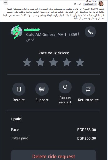 اشتكت إحدى العميلات التي استخدمت تطبيق in Drive، من تعرضها للاحتيال من قِبل أحد سائقي الشركة، بعد طلبها لـ رحلة تقدر قيمتها بـ 253 جنيها، وذلك عبر منشورًا على موقع التواصل الاجتماعي فيسبوك.