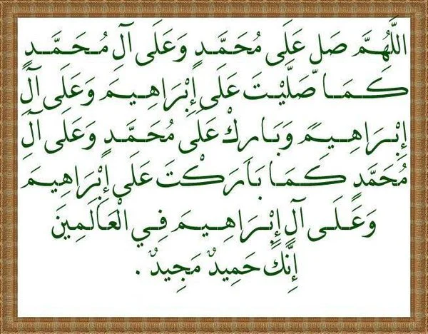 - اللَّهُمَّ صَلِّ عَلَى مُحَمَّدٍ وَعَلَى آلِ مُحَمَّدٍ، كما صليت على إبراهيم، وعلى آل إبراهيم، إنك حميد مجيد، اللَّهُمَّ بَارِكْ عَلَى مُحَمَّدٍ وَعَلَى آلِ مُحَمَّدٍ، كما باركت على إبراهيم وعلى آل إبراهيم، إنك حميد مجيد" رواه البخاري ومسلم.