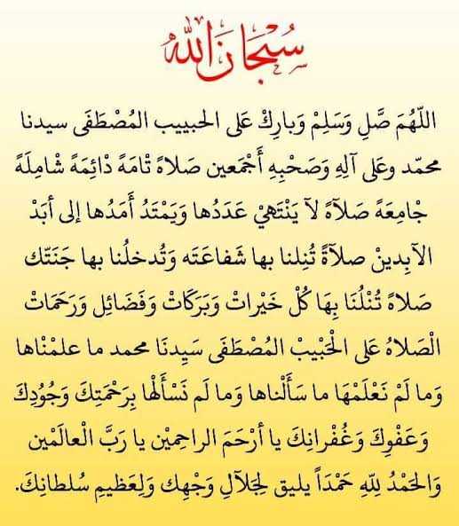 - اللهم صل وسلم على سيدنا محمد عدد النبات والأزهار، وصل وسلم على سيدنا محمد عدد أوراق الأشجار، وصل وسلم على سيدنا محمد عدد الحبوب والثمار، وصل وسلم على سيدنا محمد عدد الرمل والأحجار، وصل وسلم على سيدنا محمد في الليل والنهار، وصل وسلم على سيدنا محمد نور القلوب والأبصار ومجلي الهم والأكدار، وصل اللهم وسلم عليه وعلى اله بعدد مخلوقاتك في البر والبحار وبعدد أهل الجنة وأهل النار من يوم خلقت الدنيا إلى يوم القيامة في كل يوم ألف.