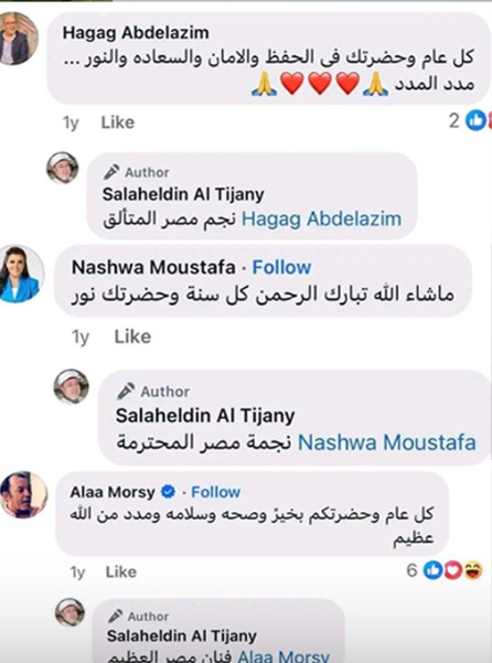 وأضافت الصورة المرفقة التي تظهر تفاعلات بين الفنانين والشيخ التيجاني على وسائل التواصل الاجتماعي مزيدا من الوقود للنقاش، في هذه الصورة، إذ علق الفنان علاء مرسي على منشور للتيجاني، قائلا: كل عام وحضرتكم بخير وصحة وسلامة ومدد من الله عظيم، كما ظهرت الفنانة نشوى مصطفى وهي تمدح الشيخ التيجاني بقولها: ما شاء الله تبارك الرحمن كل سنة وحضرتك نور، مما يبرز العلاقة الواضحة بينهما وبين التيجاني.