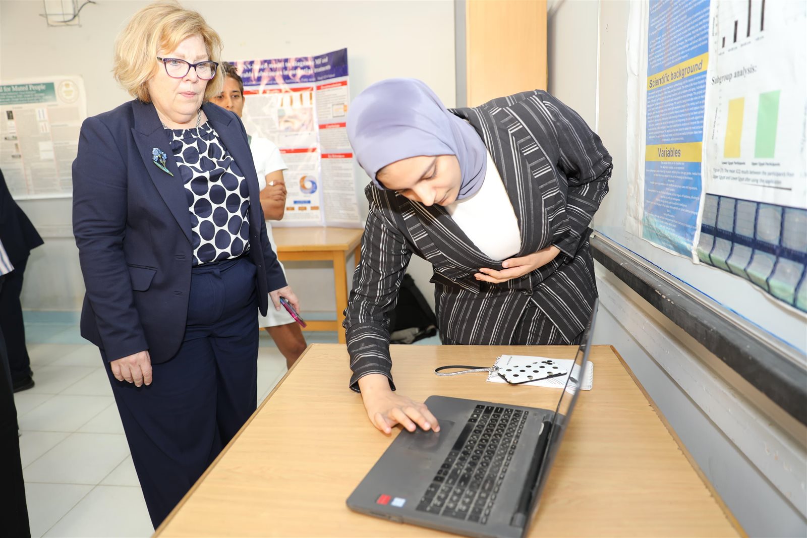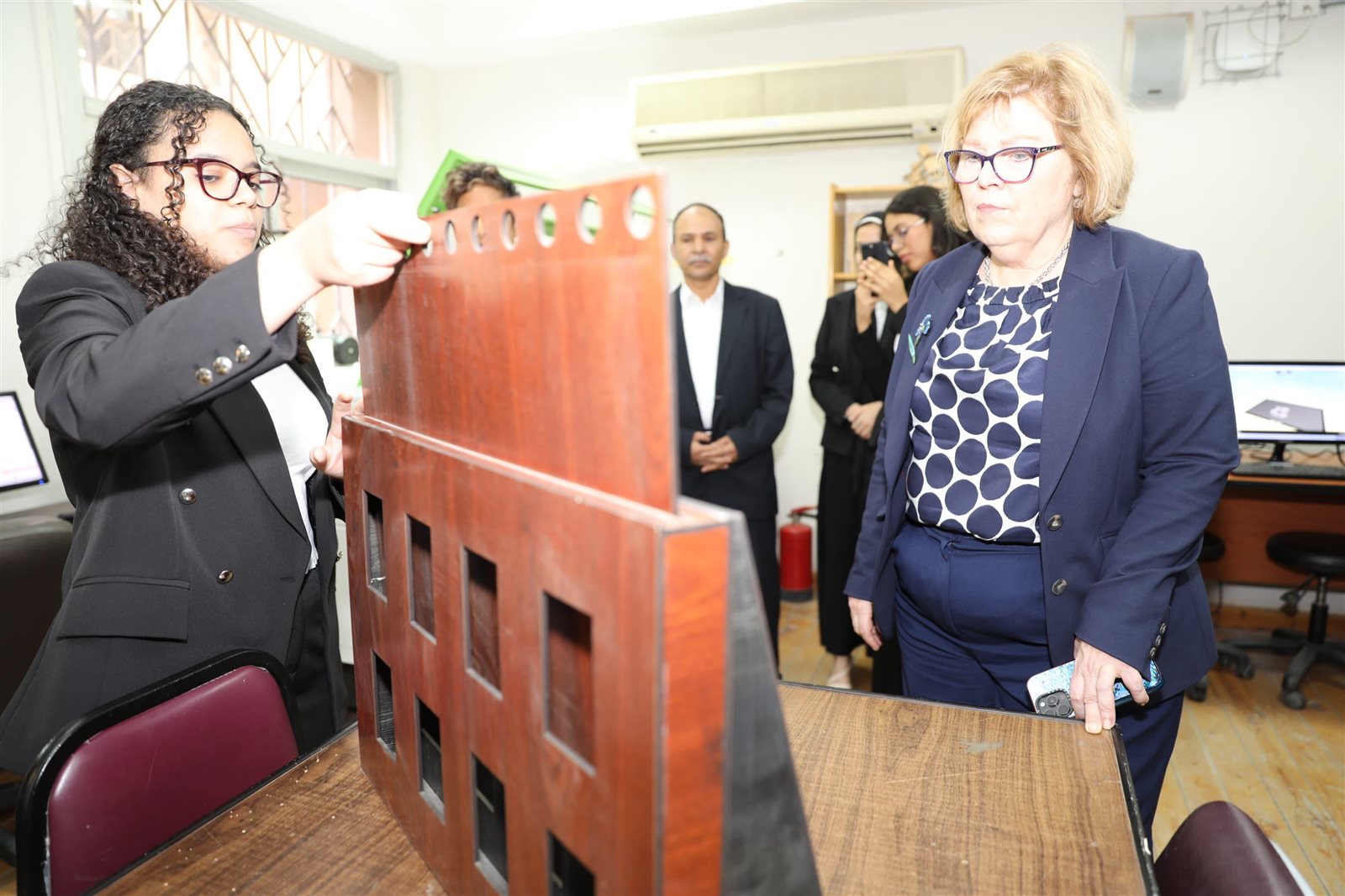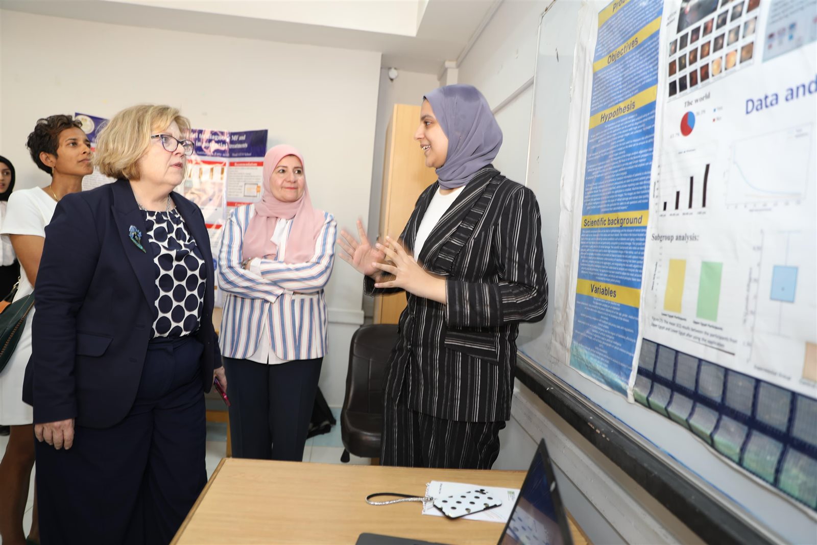 كما استمعت باربرا ليف لشرح الطالبات عن استخدامات الأجهزة المختلفة وخطوات استخدام كل جهاز، كما شاهدت التصميمات والمشروعات التي أعدتها الطالبات، حيث أشادت بمشروعات "Capstone" والتي تمثل التطبيق العملي لما تدرسه الطالبات في المواد الدراسية المختلفة وتتناول وضع حلول للتحديات الكبرى مثل (التغيرات المناخية، والتصحر، والتلوث، ونقص المياه، والزيادة السكانية وغيرها)، بهدف تعلم الطالبات حل المشكلات، والربط بين المواد المختلفة، وربط ما يتعلمنه بالحياة الواقعية، فضلًا عن مشاركتهن بهذه المشروعات في المسابقة الدولية للعلوم والهندسة International Science and Engineering Fair (ISEF)، وحققن فيها نتائج رائعة، وفزن بجوائز دولية، ومراكز متقدمة على مستوى العالم.