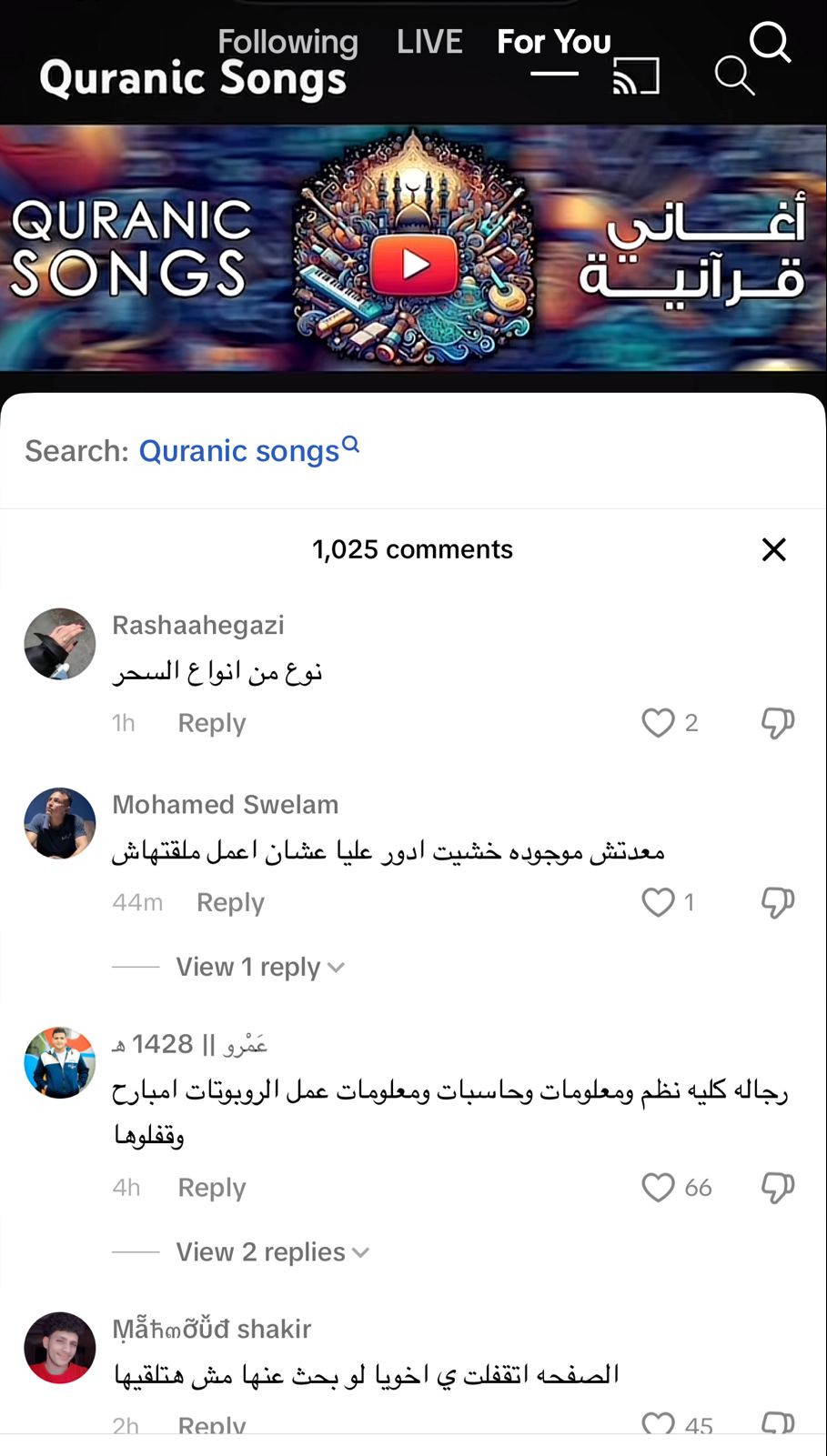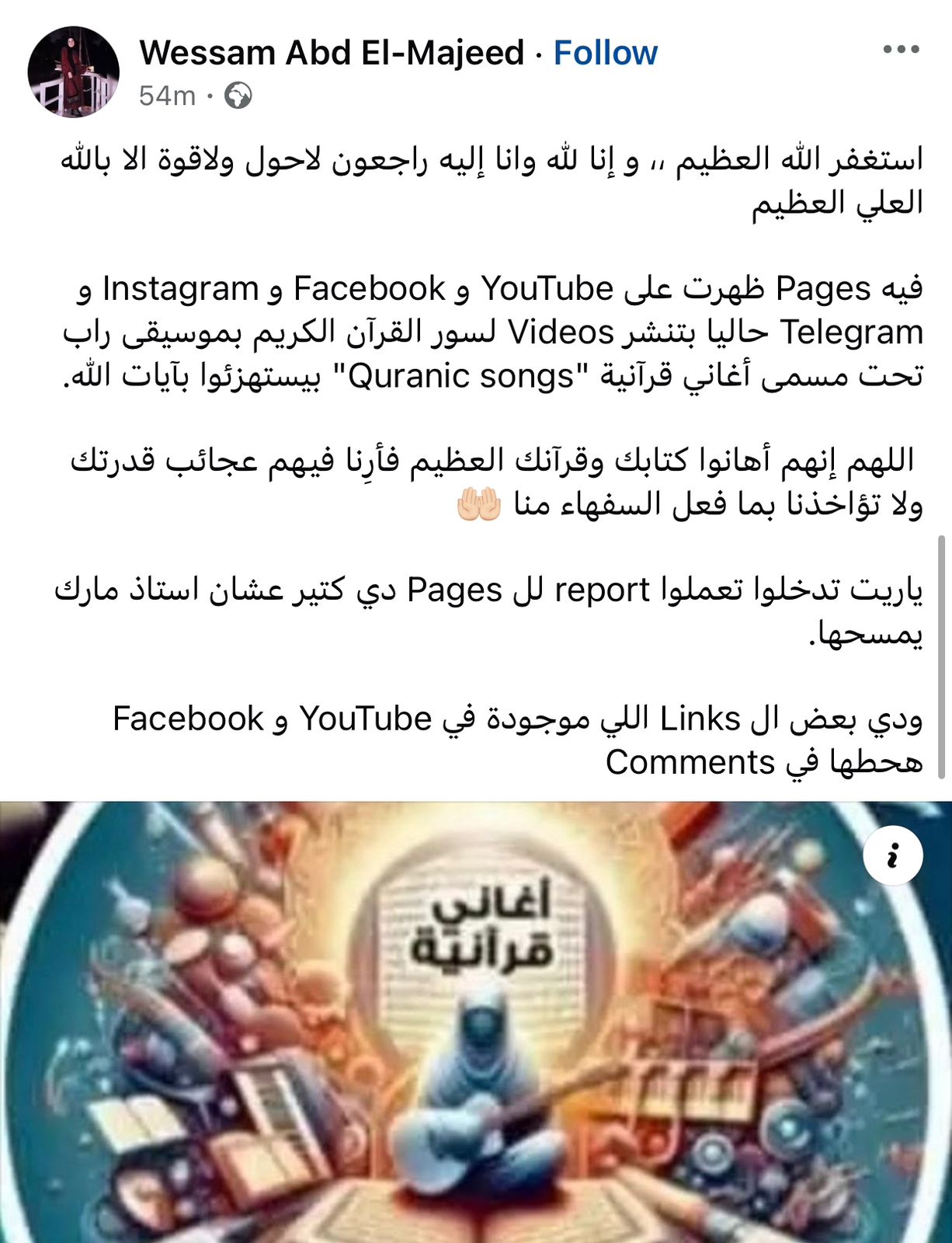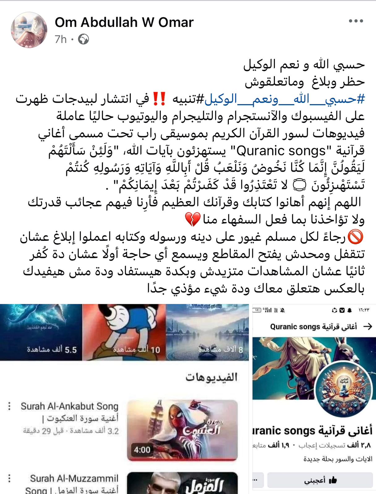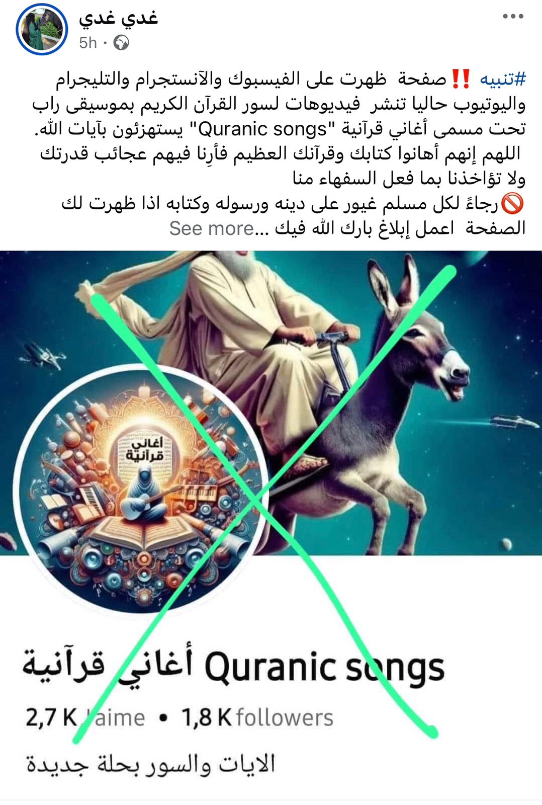 وفي نفس السياق، كتب أحد المتابعين: يستهزؤون بـ آيات الله، وآخر قال: رجاء من كل مسلم غيور على دينه وكتابه.. اعملوا إبلاغ عشان الصفحة تتقفل ومحدش يفتح ويسمع عشان ده كُفر.