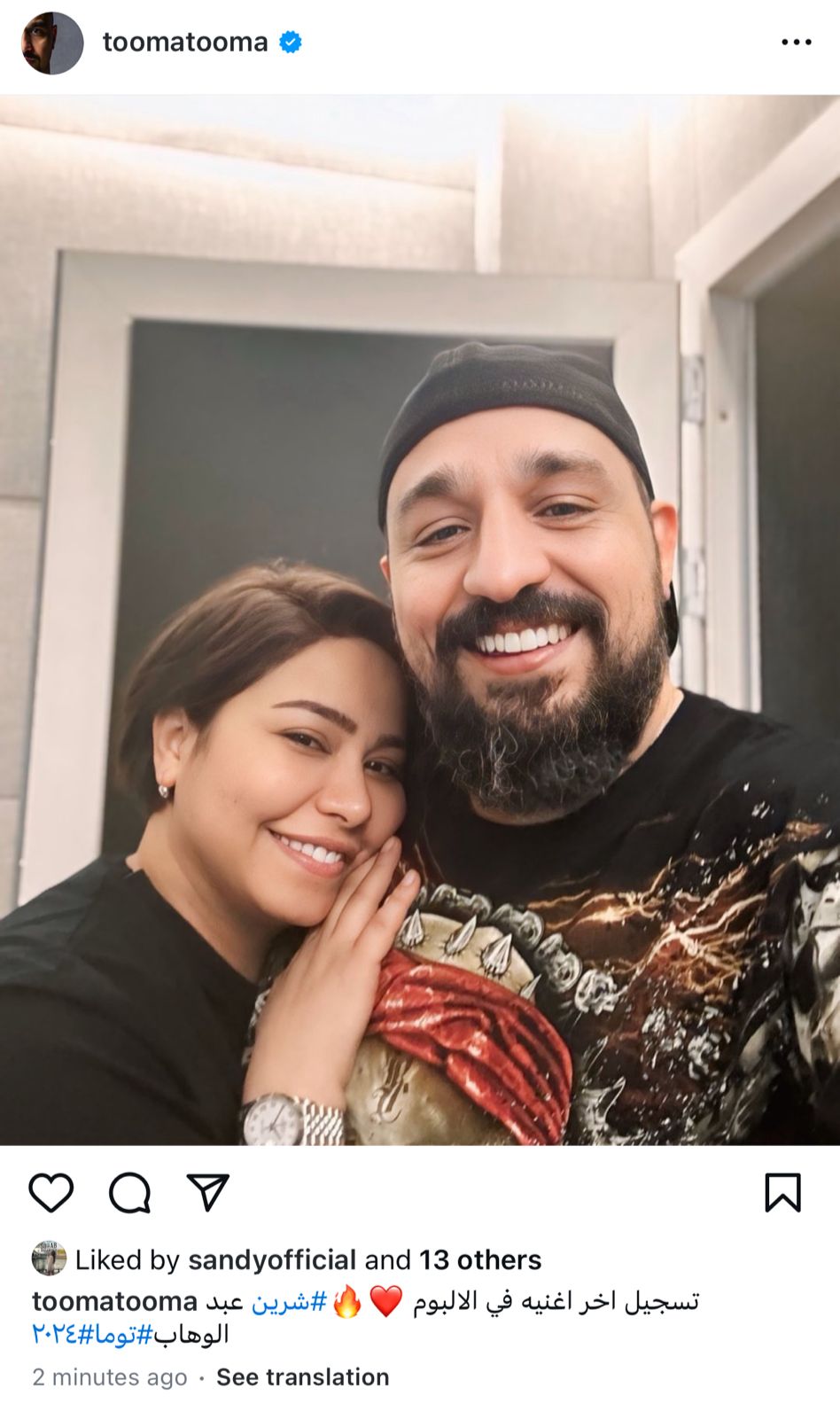 ونشر توما، صورة جمعته بـ شيرين عبد الوهاب، من الاستوديو، عبر حسابه الشخصي بموقع تبادل الصور والفيديوهات انستجرام، وكتب: تسجيل آخر أغنية في الألبوم.