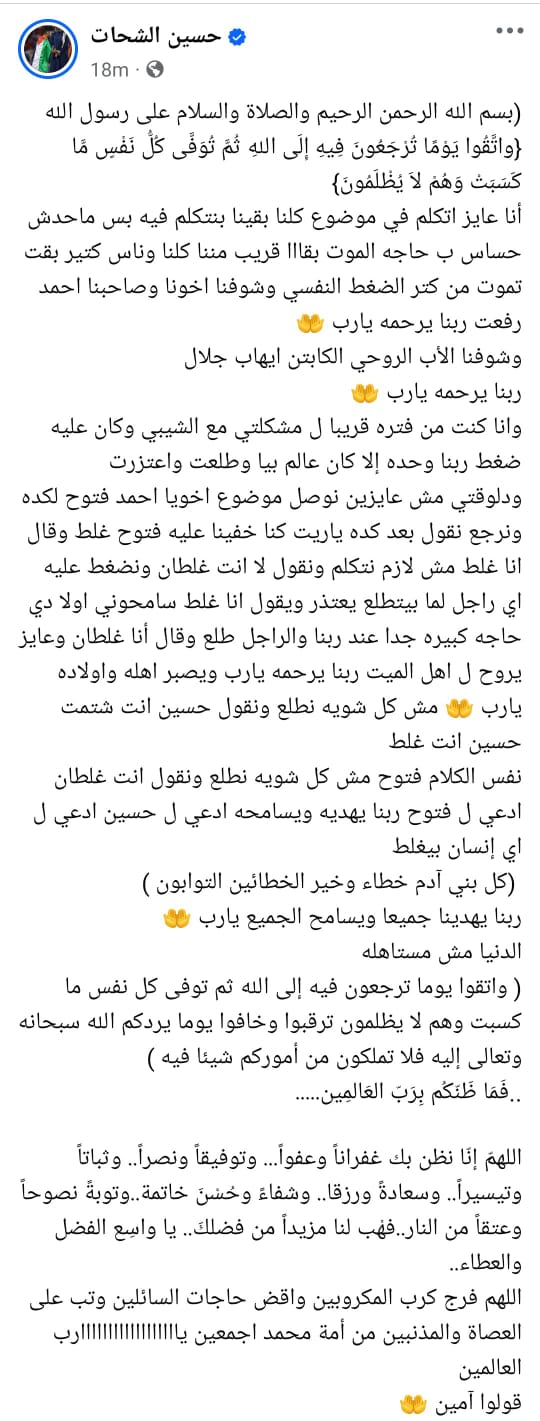 وقال حسين الشحات عبر حسابه الشخصي على موقع التواصل الاجتماعي فيسبوك: بسم الله الرحمن الرحيم والصلاة والسلام على رسول الله، {واتَّقُوا يَوْمًا تُرْجَعُونَ فِيهِ إِلَى اللهِ ثُمَّ تُوَفَّى كُلُّ نَفْسٍ مَّا كَسَبَتْ وَهُمْ لاَ يُظْلَمُونَ، أنا عايز أتكلم في موضوع كلنا بقينا بنتكلم فيه بس محدش حاسس بحاجة، الموت بقى قريب مننا كلنا وناس كتير بتموت من كتر الضغط النفسي، وشوفنا اخونا وصاحبنا أحمد رفعت ربنا يرحمه يا رب، وشوفنا الأب الروحي إيهاب جلال ربنا يرحمه يا رب.