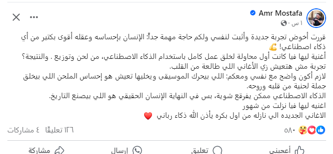 واختتم منشوره بالإعلان عن إصداره لأغاني جديدة ابتداء من الغد، مشيرا إلى أنها ستكون من إبداع ذكاء رباني في إشارة إلى الاعتماد الكامل على الإحساس البشري في التلحين، عمرو مصطفى الذي طالما قدم ألحانا تاريخية، يبدو الآن أكثر تمسكا بأن الإبداع الإنساني هو الذي يبقى، في تحول لافت عن موقفه السابق بشأن الذكاء الاصطناعي.