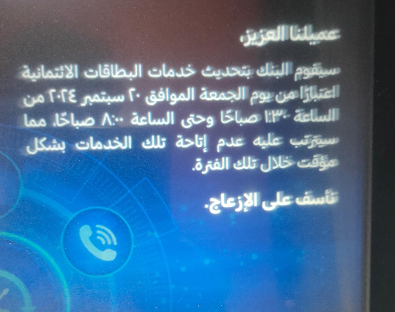 وأوضح البنك في رسالة موجهة لعملائه قائلا: عميلنا العزيز، نود أن نحيطكم علمًا أننا سنجري تحديثًا لخدمات بطاقات الائتمان؛ مما سيترتب عليه عدم إتاحة تلك الخدمات يوم الجمعة الموافق 20 سبتمبر من الساعة 1:30 صباحًا وحتى الساعة 8 صباحًا، ونأسف على الإزعاج.