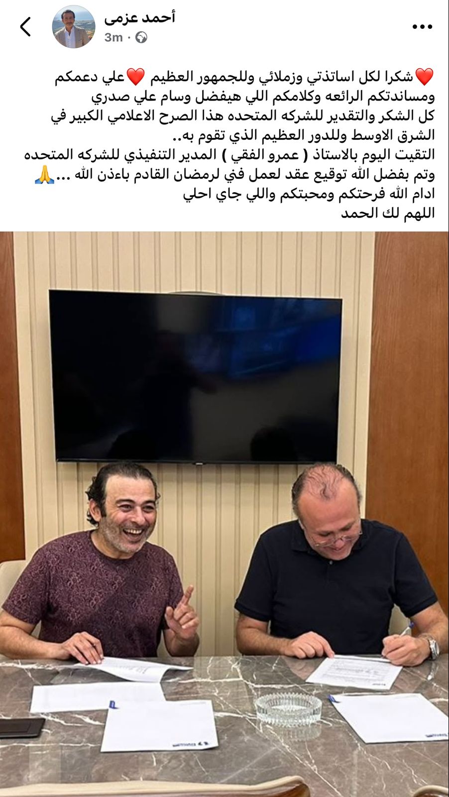 وتابع عزمي: كل الشكر والتقدير للشركة المتحدة، التقيت اليوم بالأستاذ عمرو الفقي، المدير التنفيذي للشركة المتحدة، وتم بفضل الله توقيع عقد لعمل فني لرمضان القادم بإذن الله، أدام الله فرحتكم ومحبتكم واللي جاي أحلي اللهم لك الحمد.