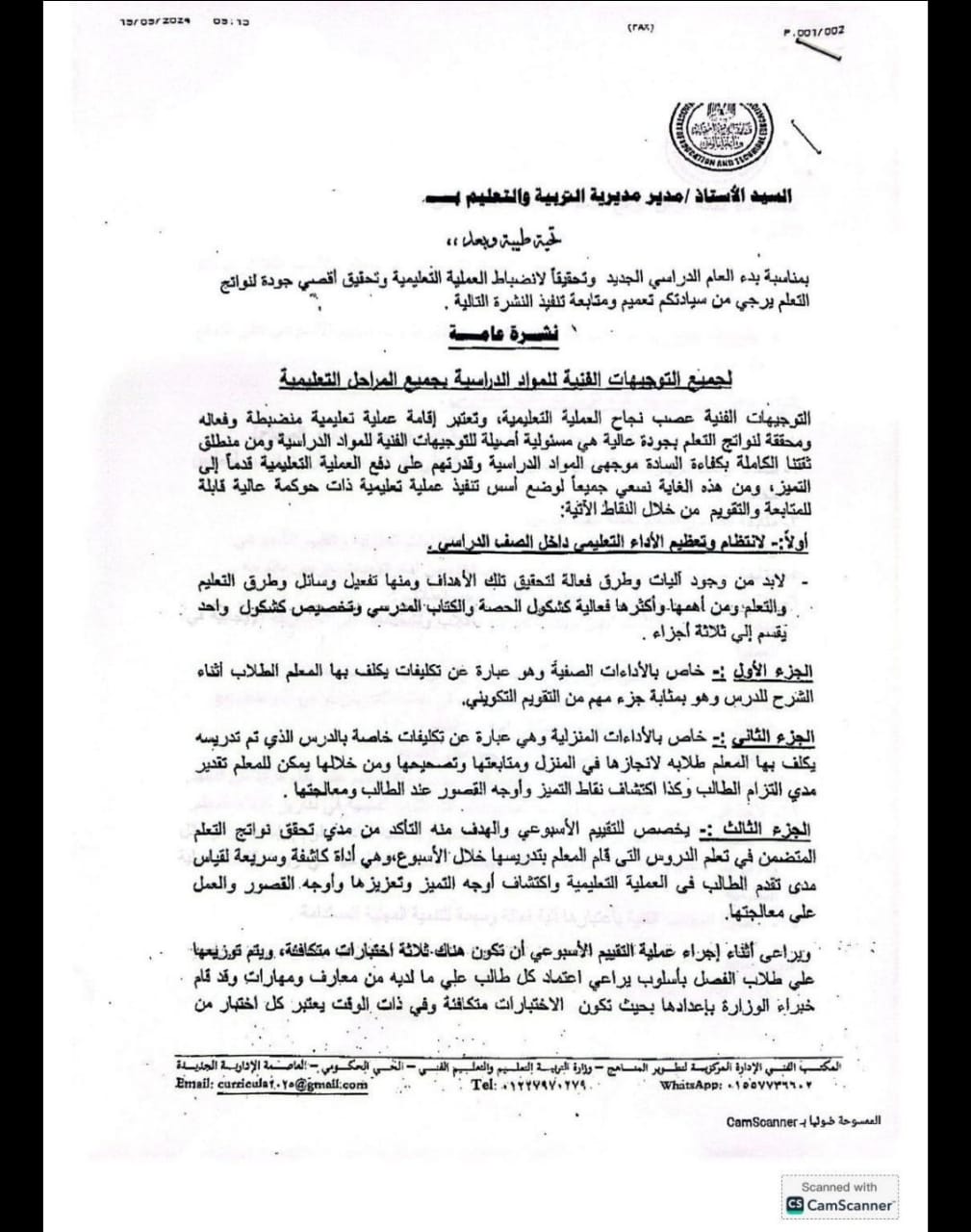 وجهت وزارة التربية والتعليم، تعليمات مهمة للمديريات تزامنا مع انطلاق العام الدراسي الجديد 2024/2025، غدا السبت، مشددة على الانتظام وتعظيم الأداء التعليمي داخل الصف الدراسي، وأنه لابد من وجود آليات وطرق الفعالة لتحقيق تلك الأهداف ومنها تفعيل وسائل وطرق التعليم والتعلم ومن أهمها وأكثرها فعالية كشكول الحصة والكتاب المدرسي وتخصيص كشكول واحد يقسم إلى 3 أجزاء.