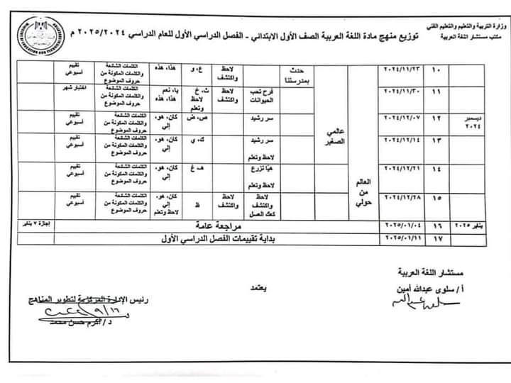 توزيع مناهج المرحلة الابتدائية 2025 اللغة العربية