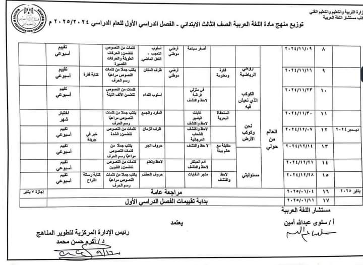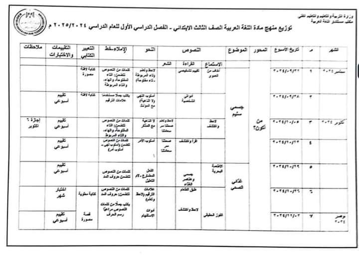 توزيع مناهج اللغة العربية الصف الثالث الابتدائي 2025 الترم الأول