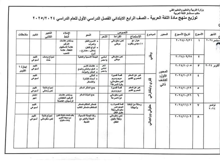 حددت وزارة التربية والتعليم توزيع مناهج اللغة العربية الصف الرابع الابتدائي الترم الأول 2025، والذي يتم تقسيم المنهج بالكامل على 3 أشهر، والتي جاءت كالتالي: