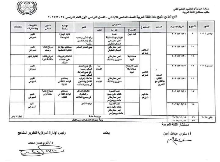 توزيع مناهج اللغة العربية الصف الخامس الابتدائي 2025