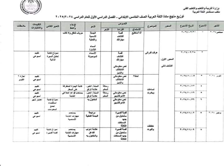 جاء توزيع مناهج اللغة العربية الصف الخامس الابتدائي 2025 للعام الدراسي الجديد، الذي ينطلق غدا، طبقا لقرار وزارة التربية والتعليم، كالتالي: