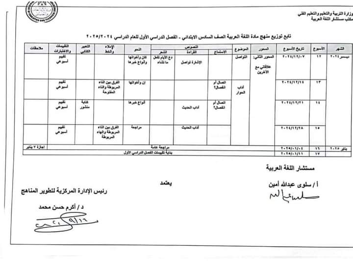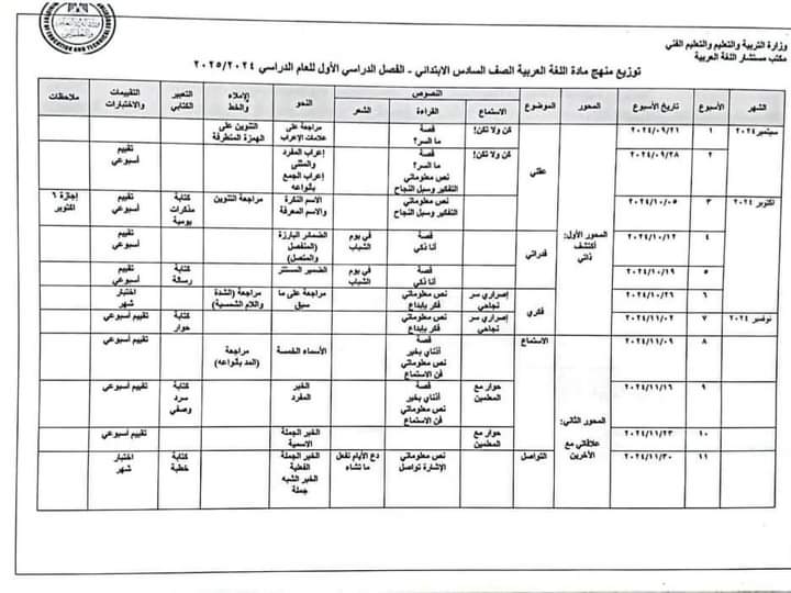 أما بالنسبة إلى منهج اللغة العربية الصف السادس الابتدائي 2024، كشفت وزارة التربية والتعليم عن توزيع مادة اللغة العربية في الفصل الدراسي الأول، والتي جاءت كالتالي: