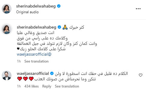 من جانبها، ردت شيرين عبد الوهاب على كلام وائل جسار عبر حسابها الرسمي على إنستجرام، موجهة له رسالة شكر قائلة: كتر خيرك، أنت صديق وغالي عليا وكلامك على راسي من فوق، وأنت كمان كنز وكان لازم تتولد في جيل العمالقة، ليعلق وائل جسار قائلا: أنتي أسطورة لن تتكرر وماتحرميناش من صوتك العذب.