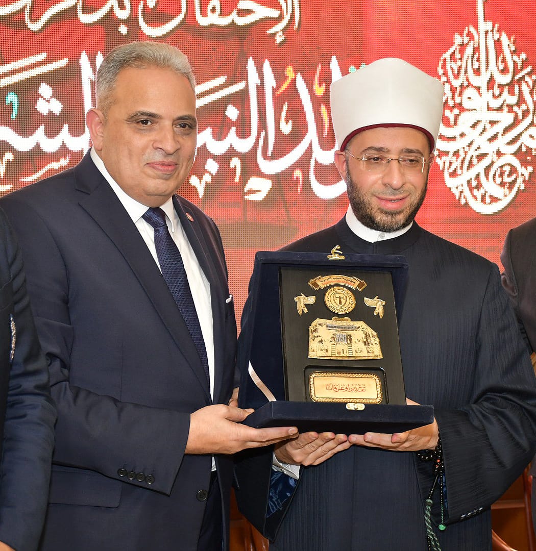 وفي ختام الاحتفال أهدى السيد المستشار أبو الحسين فتحي قايد رئيس نادي قضاة مصر الأستاذ الدكتور أسامة الأزهري وزير الأوقاف درع نادي قضاة مصر تقديرًا لجهوده العلمية والدعوية.