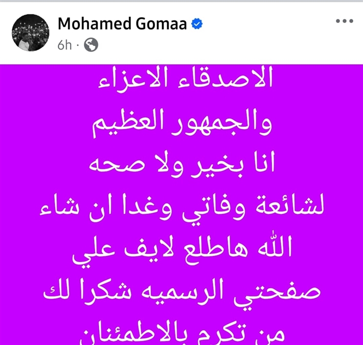 وفي أول تعليق من الفنان محمد جمعة على شائعة وفاته، كتب منشورًا عبر حسابه الشخصي بموقع فيسبوك، جاء فيه: الأصدقاء الأعزاء والجمهور العظيم، أنا بخير ولا صحة لشائعة وفاتي، وغدًا إن شاء الله هطلع لايف على صفحتي الشخصية شكرًا لكل من تكرم للاطمئنان عليّا.