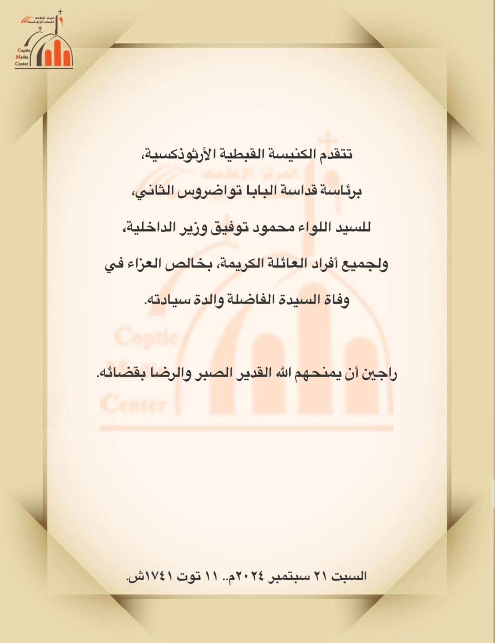 تقدمت الكنيسة القبطية الأرثوذكسية، برئاسة البابا تواضروس الثاني، بخالص العزاء، للواء محمود توفيق، وزير الداخلية، ولجميع أفراد العائلة الكريمة، في وفاة والدته، راجين أن يمنحهم الله القدير الصبر والرضا بقضائه.