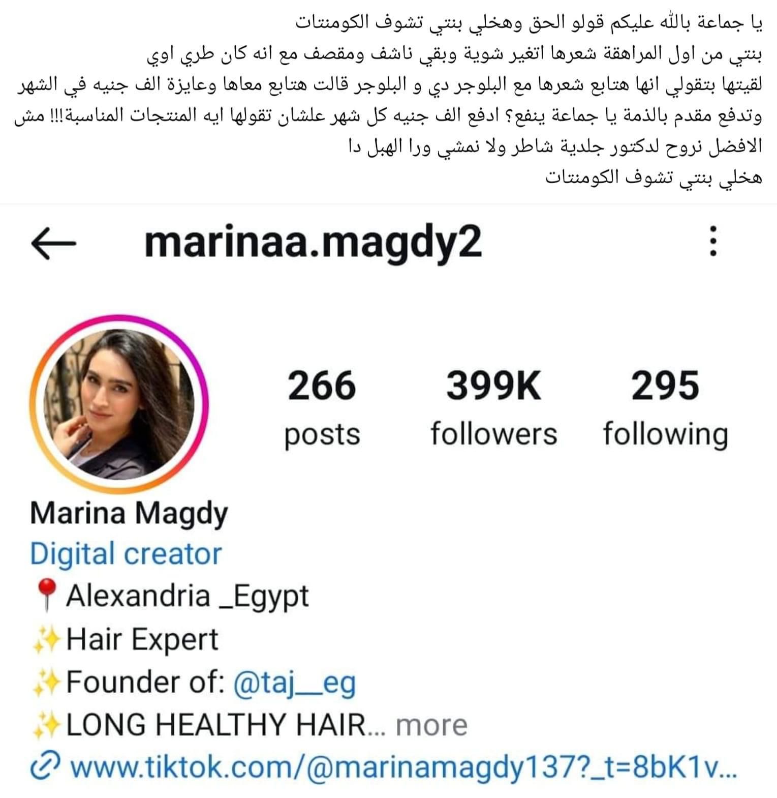واختتمت مارينا مجدي، أنا بقدم روتين مناسب لنوع الشعر وحالته، والمنتجات موجودة في الصيدليات والسوبر ماركت، وفي دكاترة كلمتني عشان يستفيدوا من خبرتي وقولت لهم آسفة معنديش وقت، والـ 1000 جنيه اللي باخدها من العميلة مش رقم وميجيبش سعر منتجين، والمبلغ دا أنا باخده مقابل خدمة بقدمها وهي وصف كورس لعلاج الشعر، أنا عندي ريڤيو من ناس في مصر وخارج مصر وكلهم بيمشوا على تعليماتي وعلى الروتين اللي برشحه لهم، وأنا بعتبر نفسي خبيرة شعر.