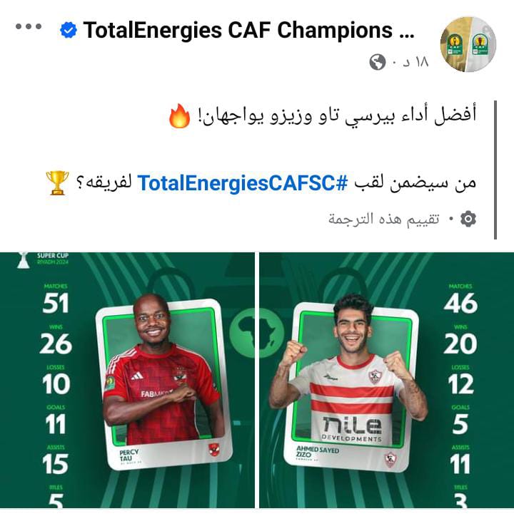 أجرى الحساب الرسمي للاتحاد الإفريقي لكرة القدم كاف على مواقع التواصل الاجتماعي فيس بوك، مقارنة بين الثنائي بيرسي تاو لاعب الأهلي وأحمد سيد زيزو لاعب فريق الزمالك قبل مباراة السوبر الإفريقي بين الأهلي والزمالك في السوبر الإفريقي يوم الجمعة المقبل.