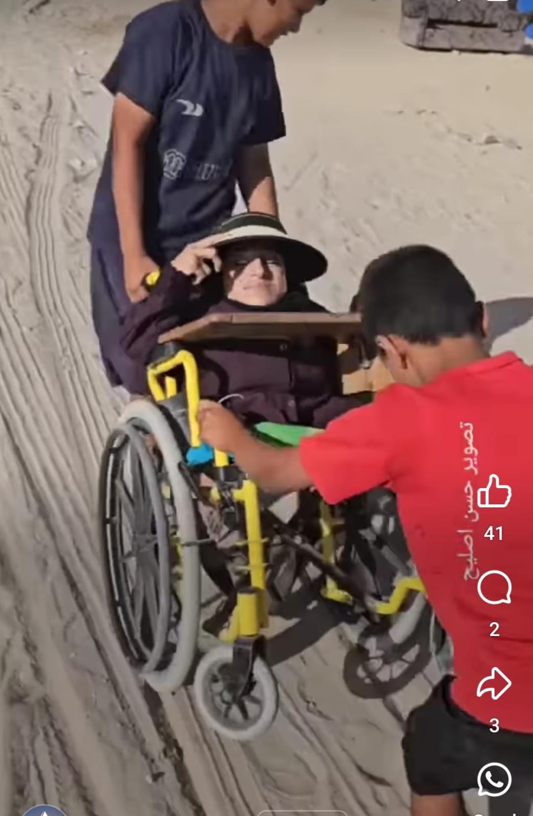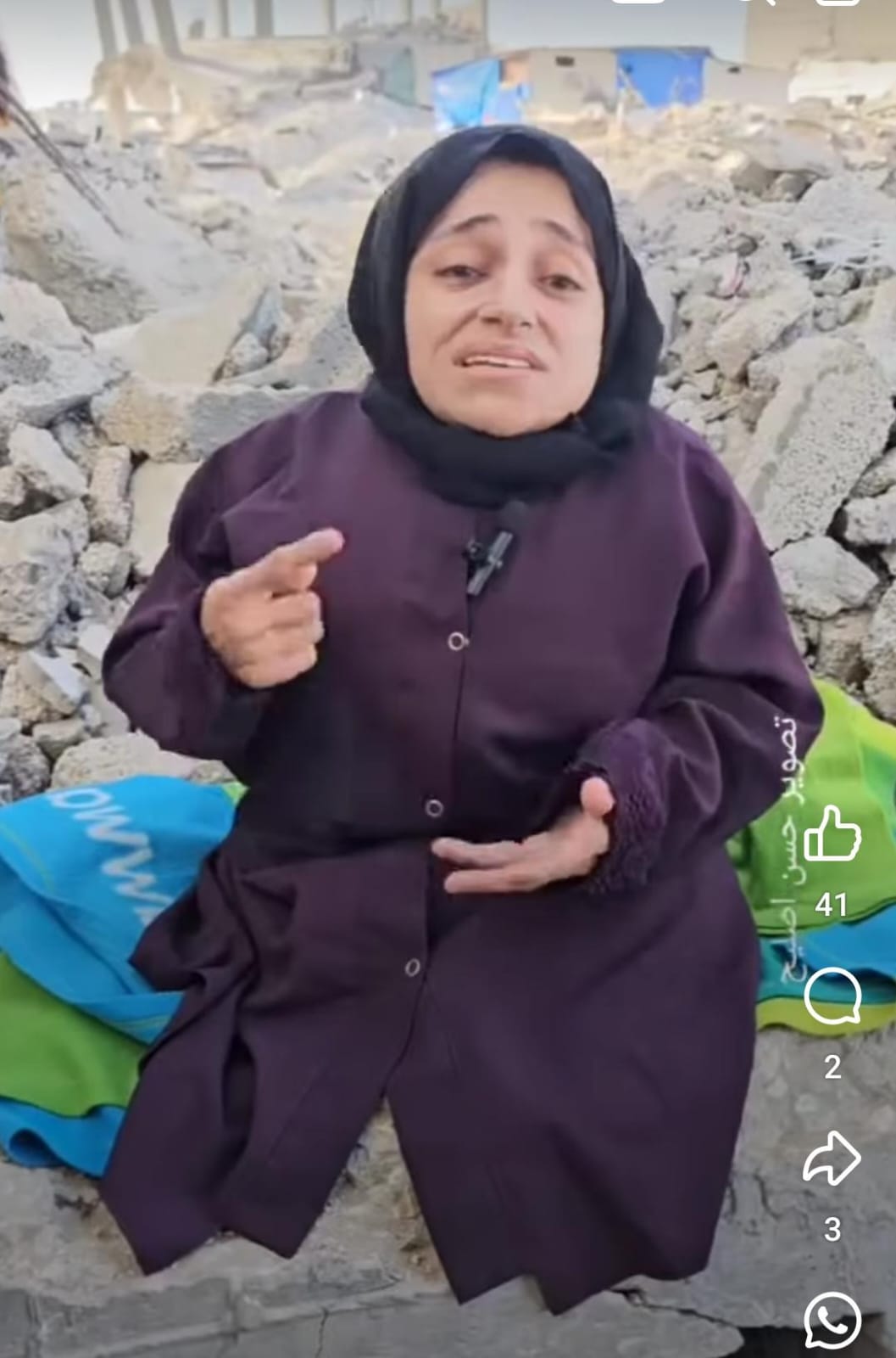 إيمان أبو صبحة، من ذوي الاحتياجات الخاصة، قالت في تصريحات صحفية: أنا عايشة في غزة، والوضع صعب هنا، عندي هشاشة في العظام ونقص في الكالسيوم وأعيش في بيت مقصوف والوضع صعب جدا مش قادرة أتحمل أكثر من ذلك.