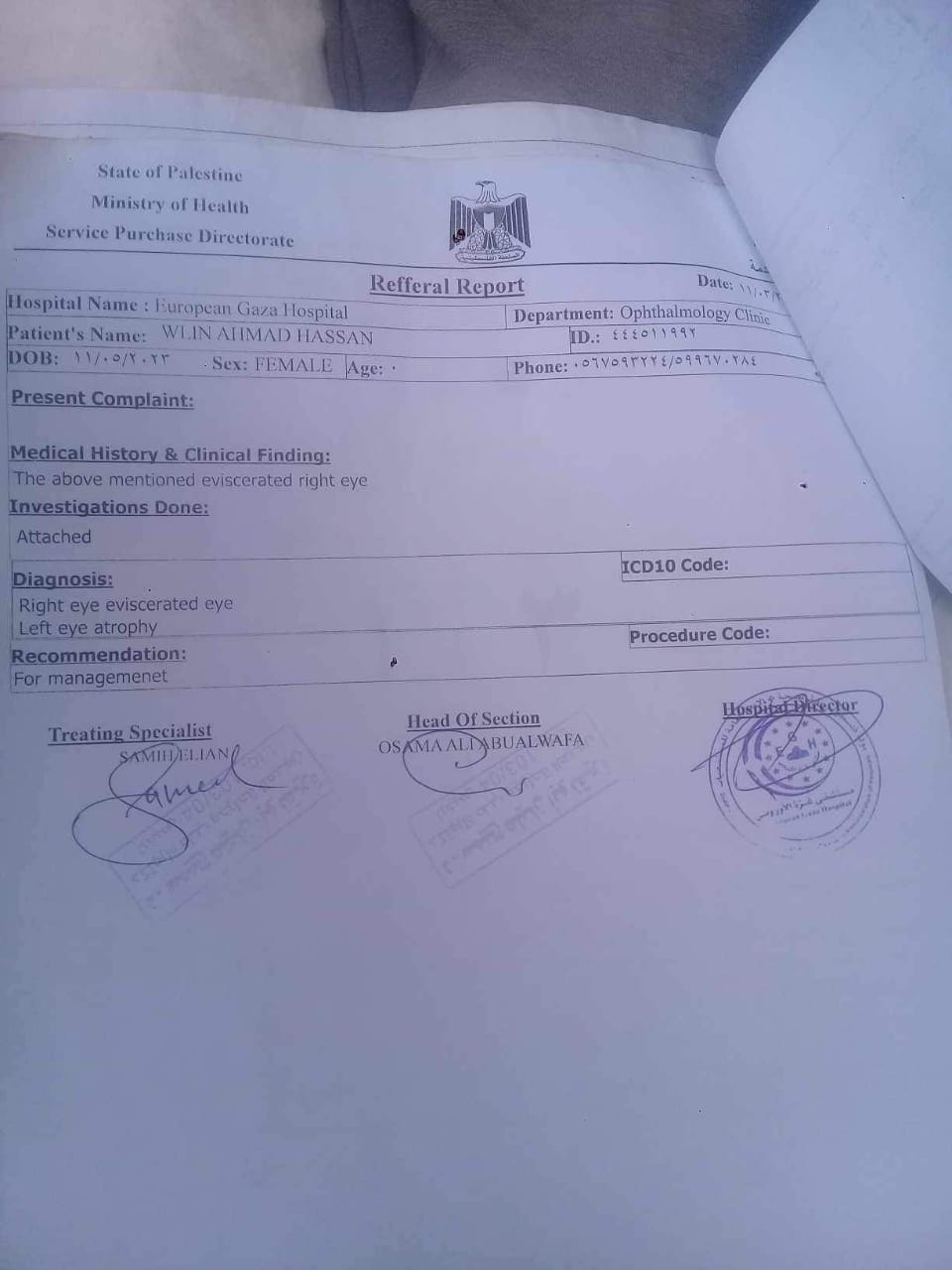 واستغاث الفلسطيني إسلام خليل عم الطفلة إيلين أحمد حسن خليل، البالغة من العمر عام ونصف، مطالبًا بالتدخل العاجل لعلاج ابنة أخيه التي تعرضت لإصابة خطيرة جراء القصف الإسرائيلي، حيث أن الطفلة فقدت عينها اليمنى بالكامل وتعاني من ضمور في مقلة العين اليسرى، مما يستدعي زراعة عين صناعية لإنقاذ حالتها.