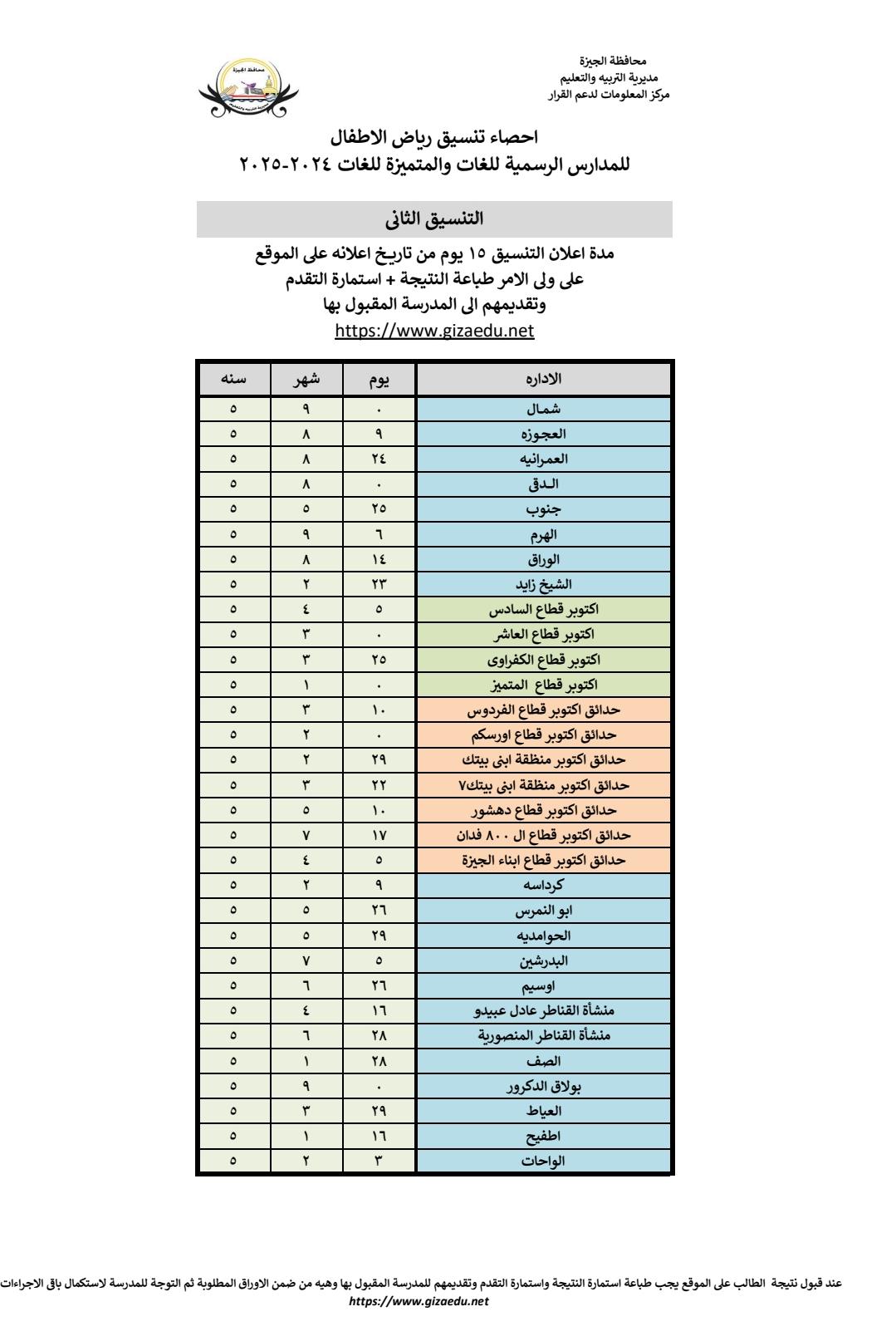 تعليم الجيزة تعلن نتيجة التنسيق الثاني لرياض الأطفال بالمدارس الرسمية والمتميزة لغات