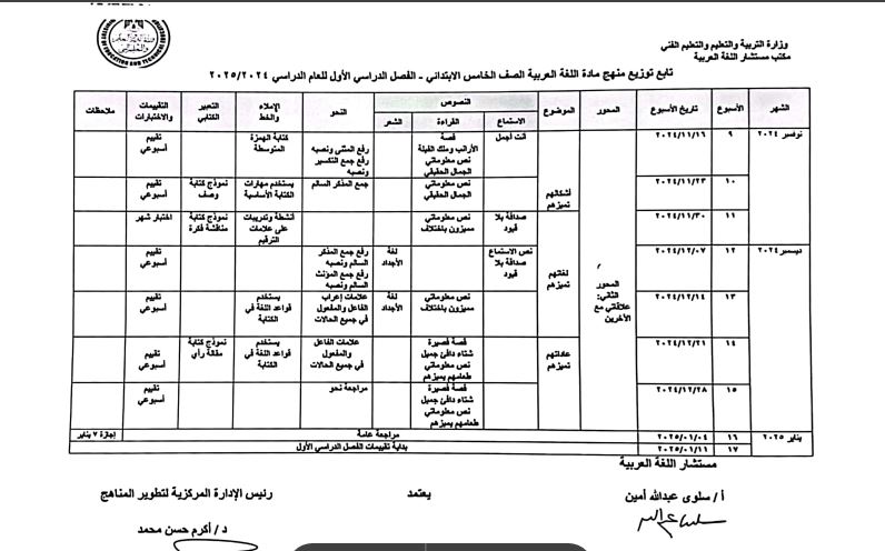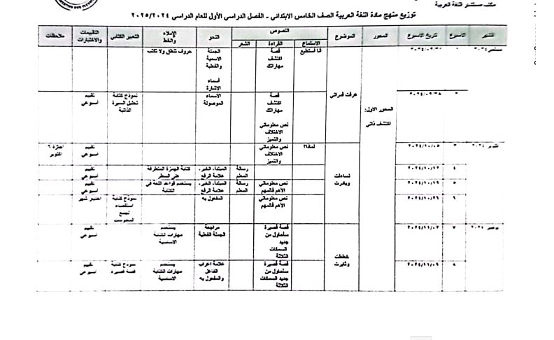 توزيع منهج اللغة العربية في الصف الخامس الابتدائي 2024