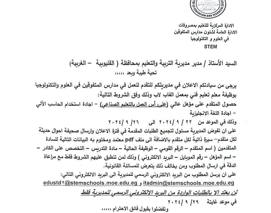 وأوضحت وزارة التربية والتعليم، في خطابًا لها ـم شروط التقديم في وظيفة معلم تعليم فني بمعمل ألفا لاب بمدارس المتفوقين في العلوم والتكنولوجيا وهي: