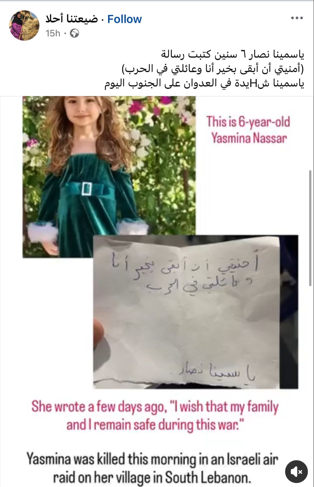 أمنيتي أن أبقى بخير.. هذه كانت آخر رسالة الصغيرة اللبنانية ياسمينا نصار قبل استشهادها على يد العدو الإسرائيلي خلال شن الغارات الجوية التي طالت عدة بلدات بقضاء صور وصيدا جنوب لبنان.