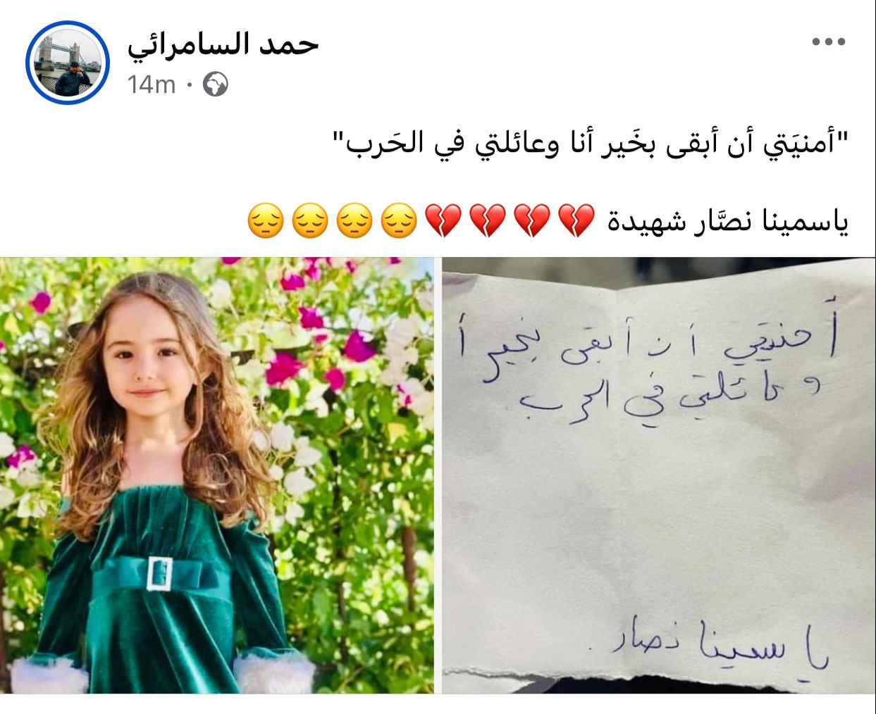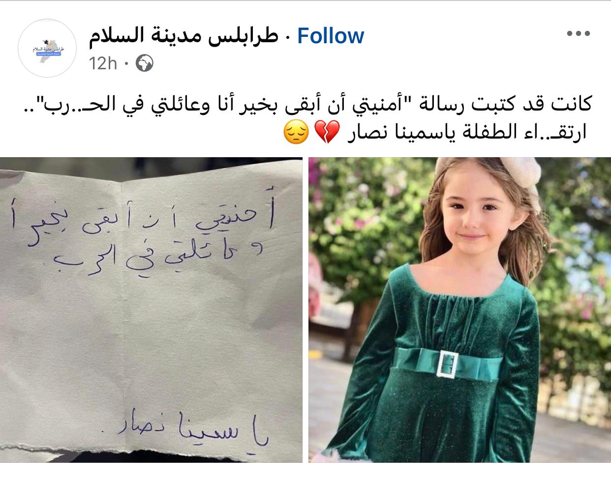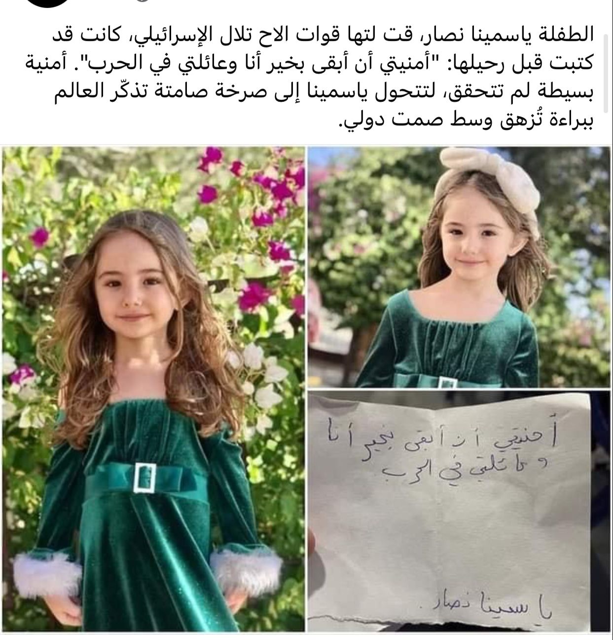 تصدرت الصغيرة اللبنانية ياسمينا نصار تريند منصات التواصل الاجتماعي بعد استشهادها فور أن كتبت رسالة تمنت فيها البقاء على قيد الحياة بخير مع عائلها خلال ظروف هذه الحرب القاسية التي شُن من خلالها غارات جوية شديدة على يد العدو الإسرائيلي.