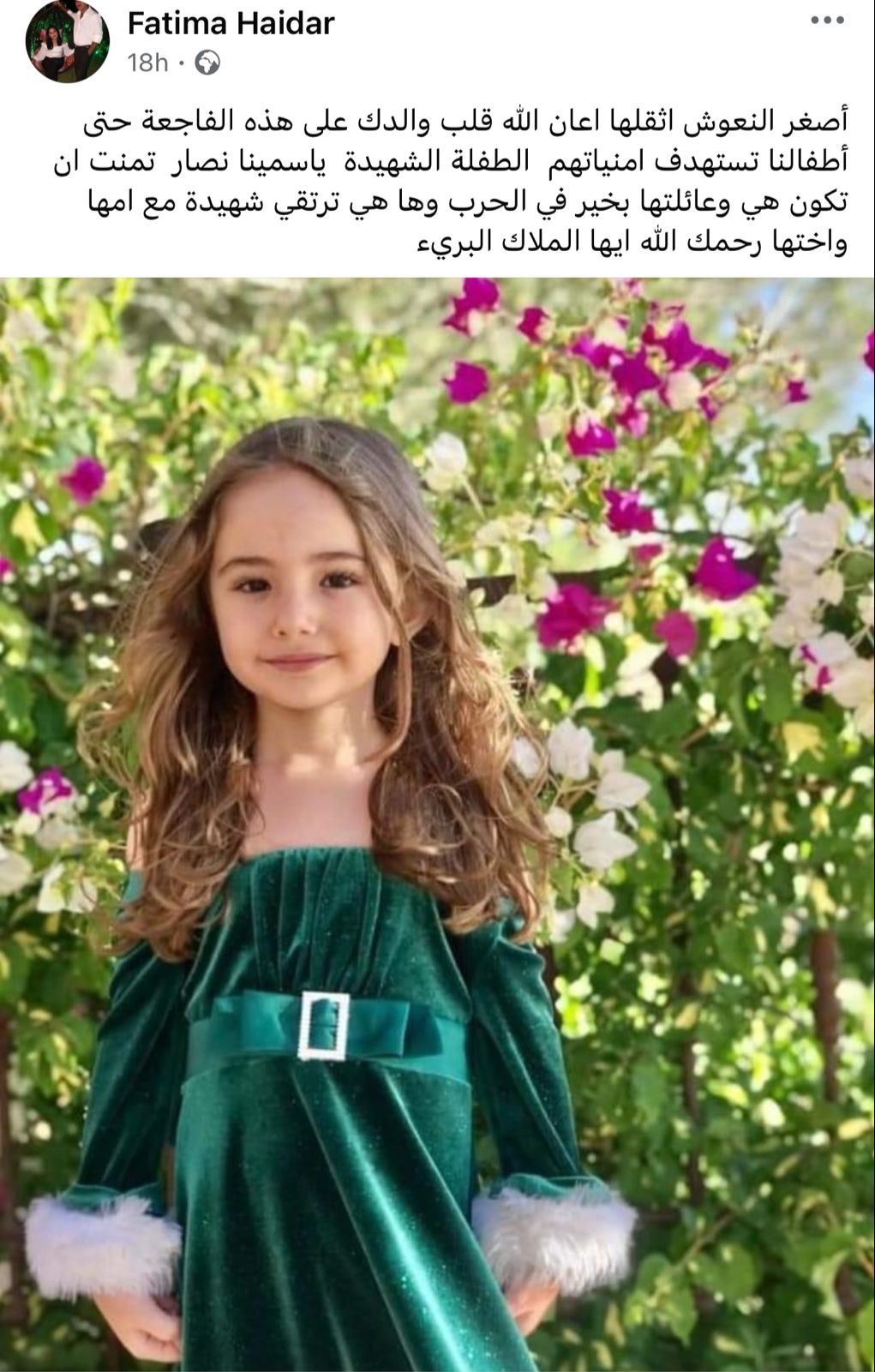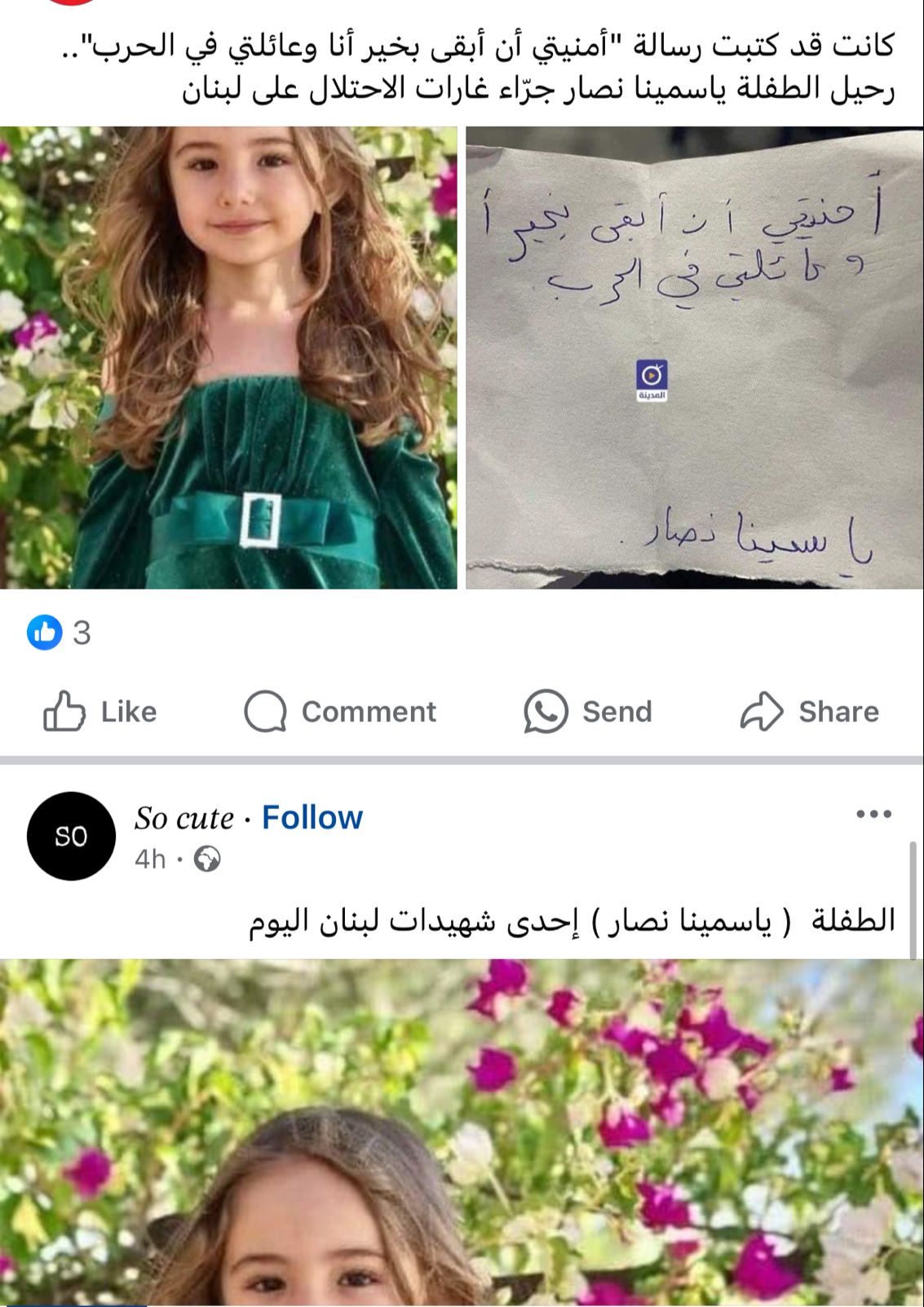 وقد تصدرت الطفلة اللبنانية ياسمينا نصار التريند عبر مواقع التواصل الاجتماعي بعد أن شارك العديد من منشورات التعزية لهذه الصغيرة التي ذهبت روحها في يد العدو الإسرائيلي ضحية هذه الحرب البائسة.
