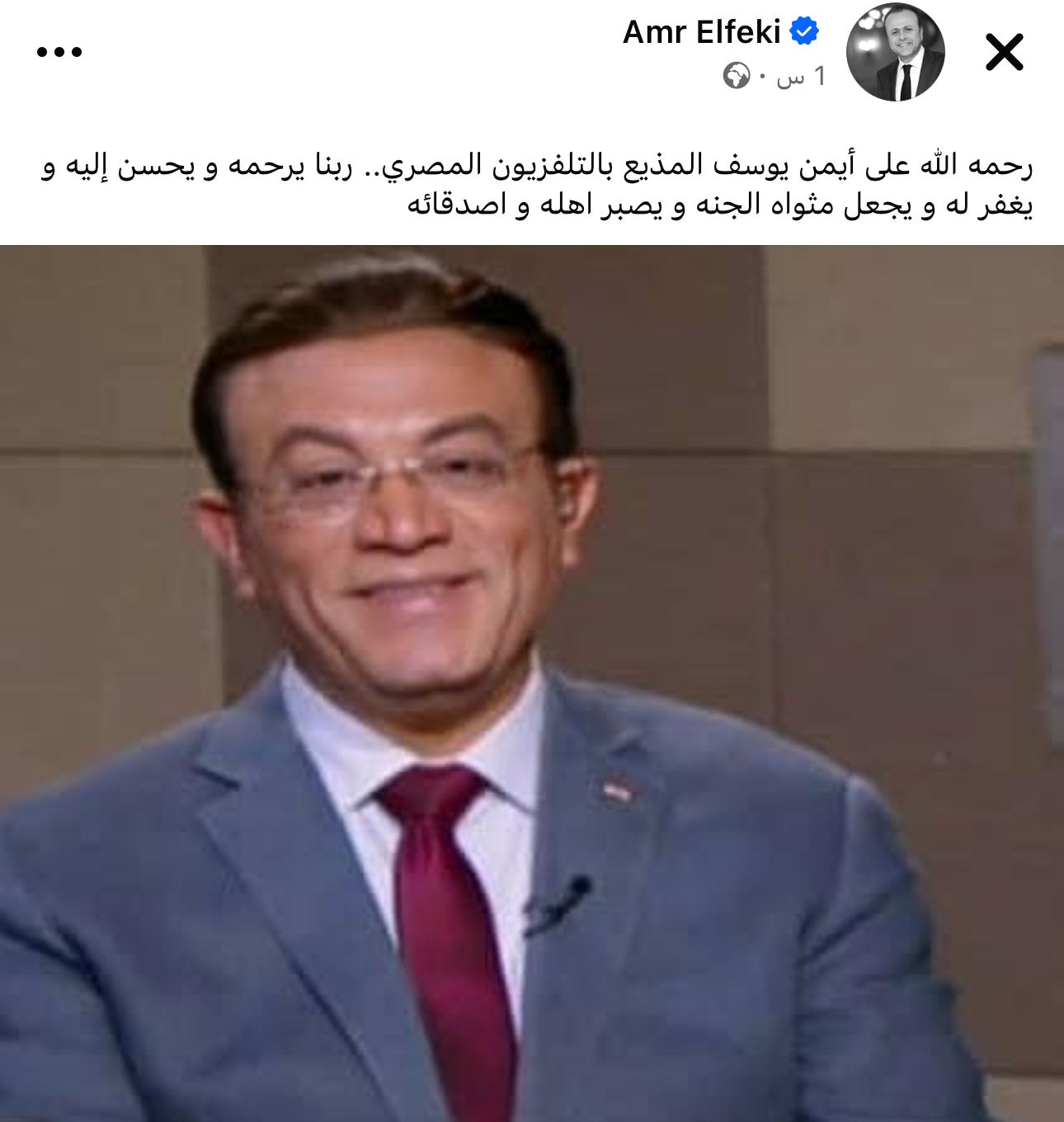 وكتب عمرو الفقي عبر حسابه الرسمي على موقع التواصل الاجتماعي فيسبوك: رحمة الله على أيمن يوسف المذيع بالتلفزيون المصري، ربنا يرحمه ويحسن إليه ويغفر له ويجعل مثواه الجنة ويصبر أهله وأصدقاءه.