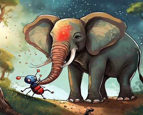 كان يا ما كان كان في مرة فيل كبير وضخم، وكان معجب بشكله وقوته جدا، وكل ما يعدي من جنب بيت النملة يتريق عليها عشان هي جسمها صغير وضعيفة، بس النملة مكنتش بتهتم بكلام الفيل، وكانت راضية بجسمها وشكلها.