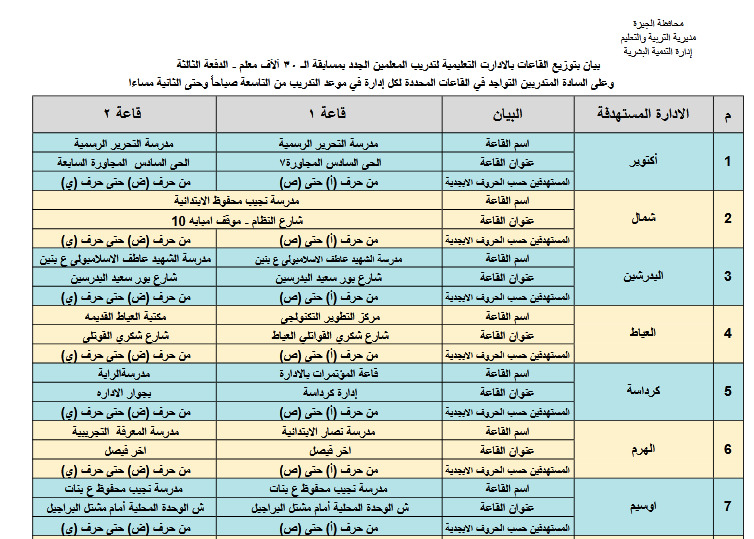 وشددت مديرية التعليم بالجيزة على المعلمين الالتزام بالأماكن الموضحة لكل إدارة بالجدول التالي: