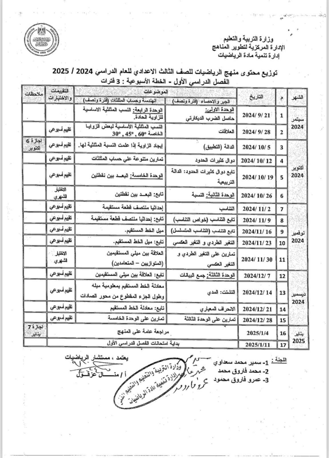 ننشر توزيع منهج الرياضيات لـ طلاب المرحلة الإعدادية 2025