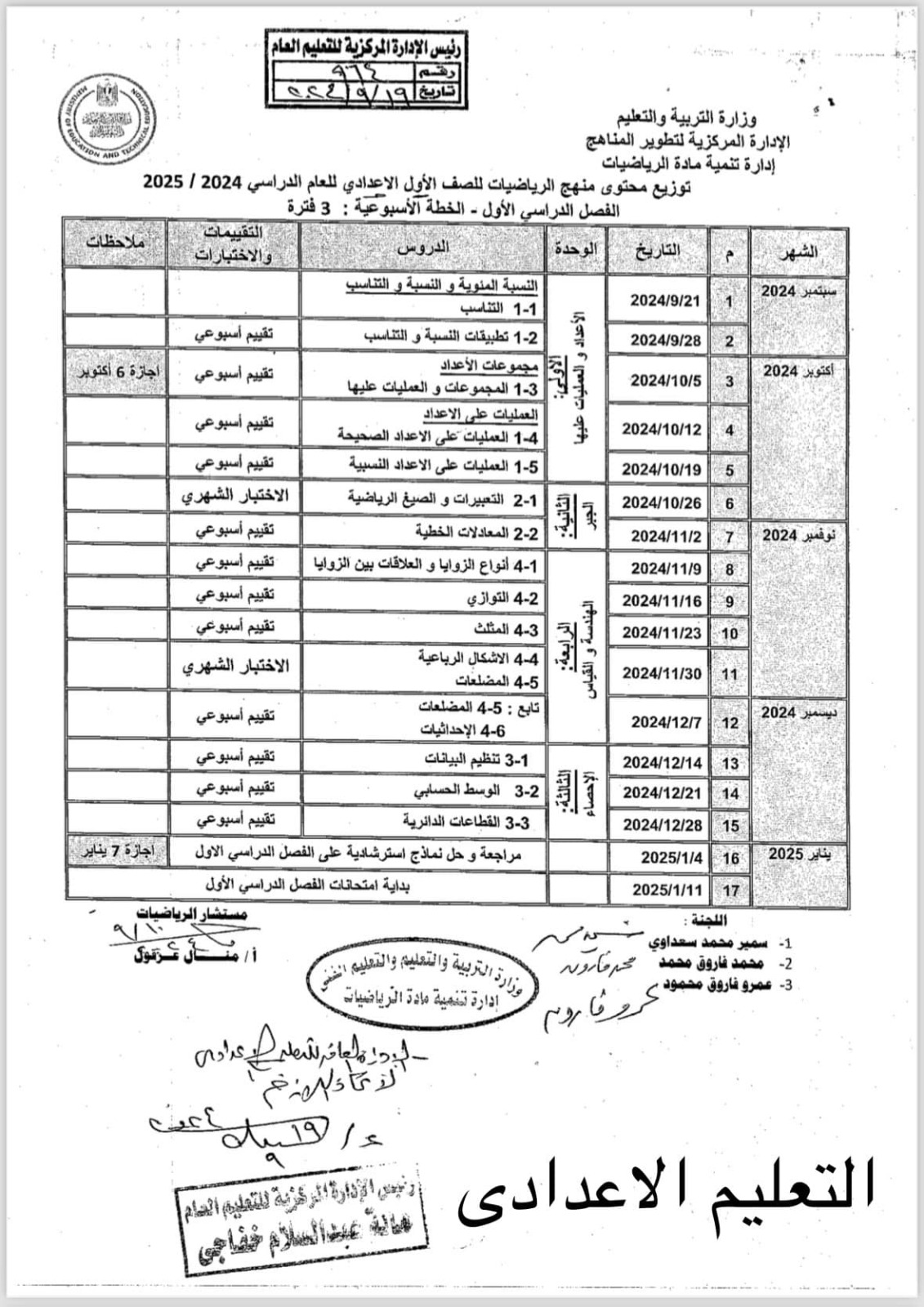 وجاء توزيع محتوى منهج الرياضيات لطلاب المرحلة الإعدادية للعام الدراسي 2024-2025 كالآتي: