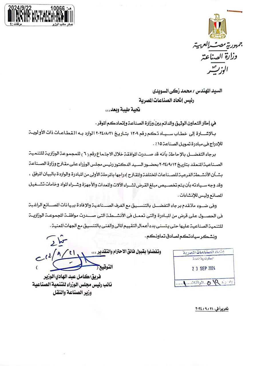 وأوضح الوزير في خطاب مرسل إلى اتحاد الصناعات المصرية، أن الحكومة وافقت على تحديد بعض القطاعات الصناعية ذات الأولوية في مبادرة الصناعة بفائدة 15%.