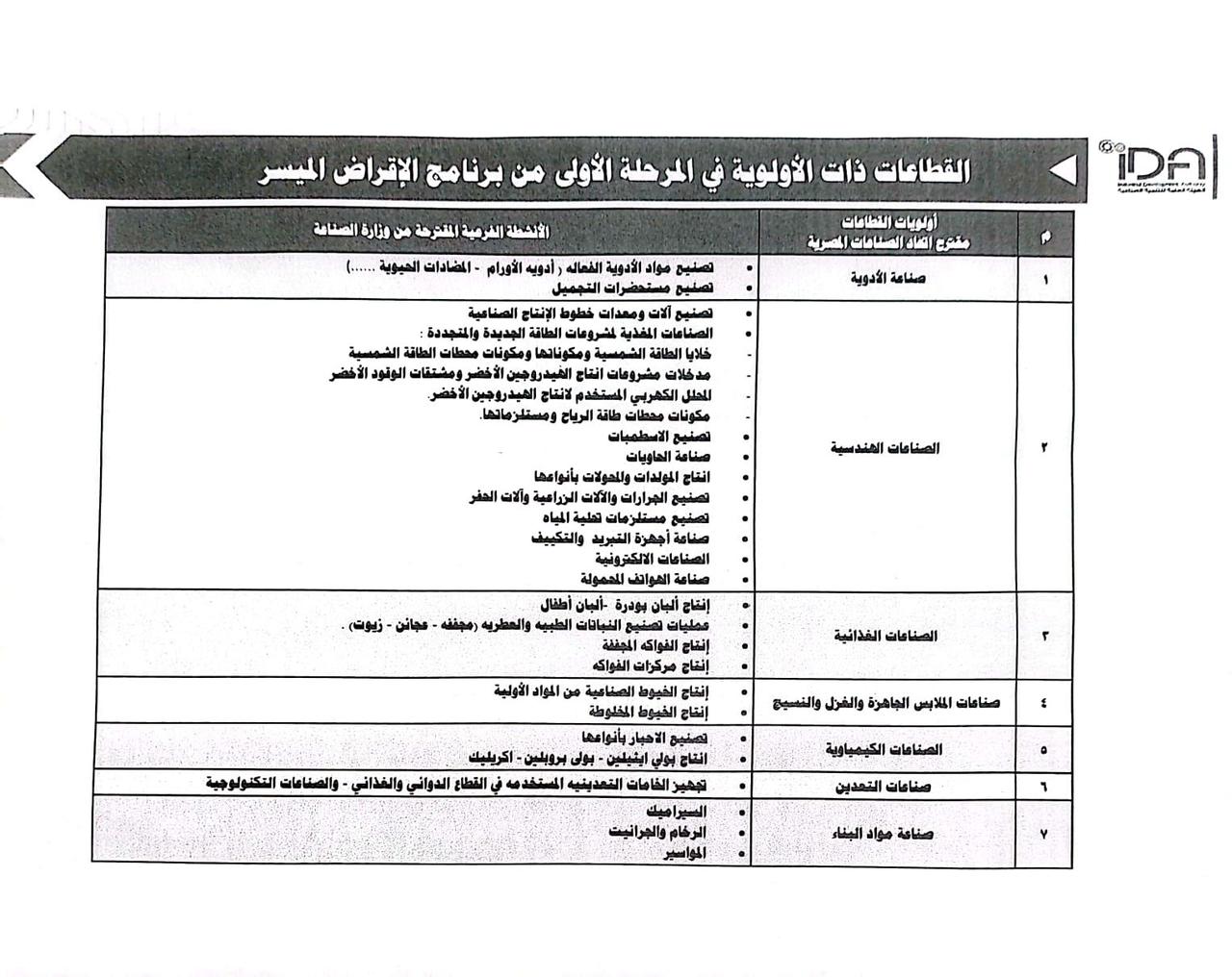 وتشمل القطاعات ذات الأولوية، الأدوية والصناعات الهندسية والصناعات الغذائية والملابس والصناعات الكيماوية والتعدين.